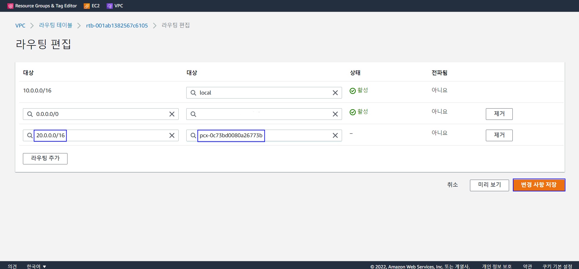 - 런던 리전 VPC의 IP주소(20.0.0.0/16)으로의 라우팅 추가