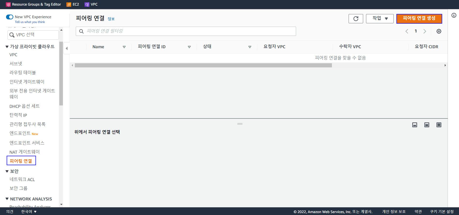 - [피어링 연결] 연결 클릭하면 피어링 목록 확인가능