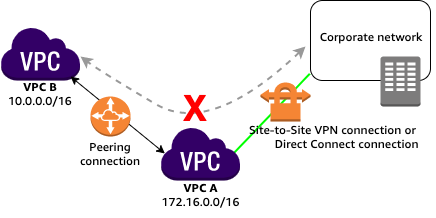 - PC A와 VPC B 사이, VPC A와 VPC C 사이에 VPC 피어링 연결이 있고 VPC B와 VPC C 사이에 VPC 피어링 연결이 없을 때, VPC A를 통해 VPC B에서 VPC C로 직접 패킷을 라우팅할 수 없음