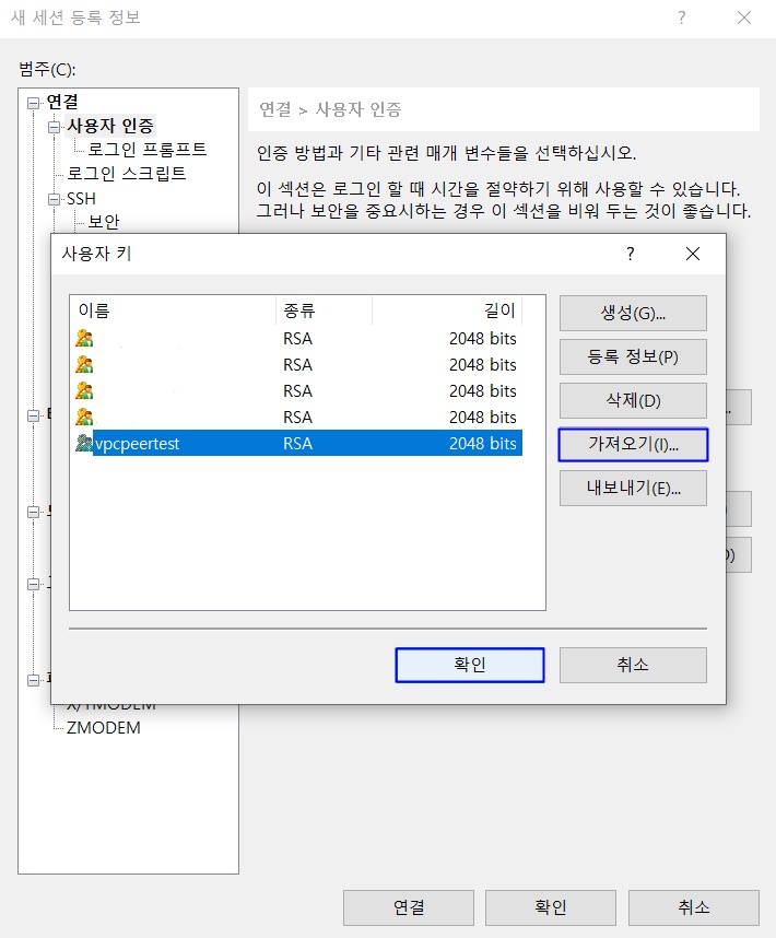- [가져오기] - [인스턴스 생성 시 다운받은 key 선택] - [확인]