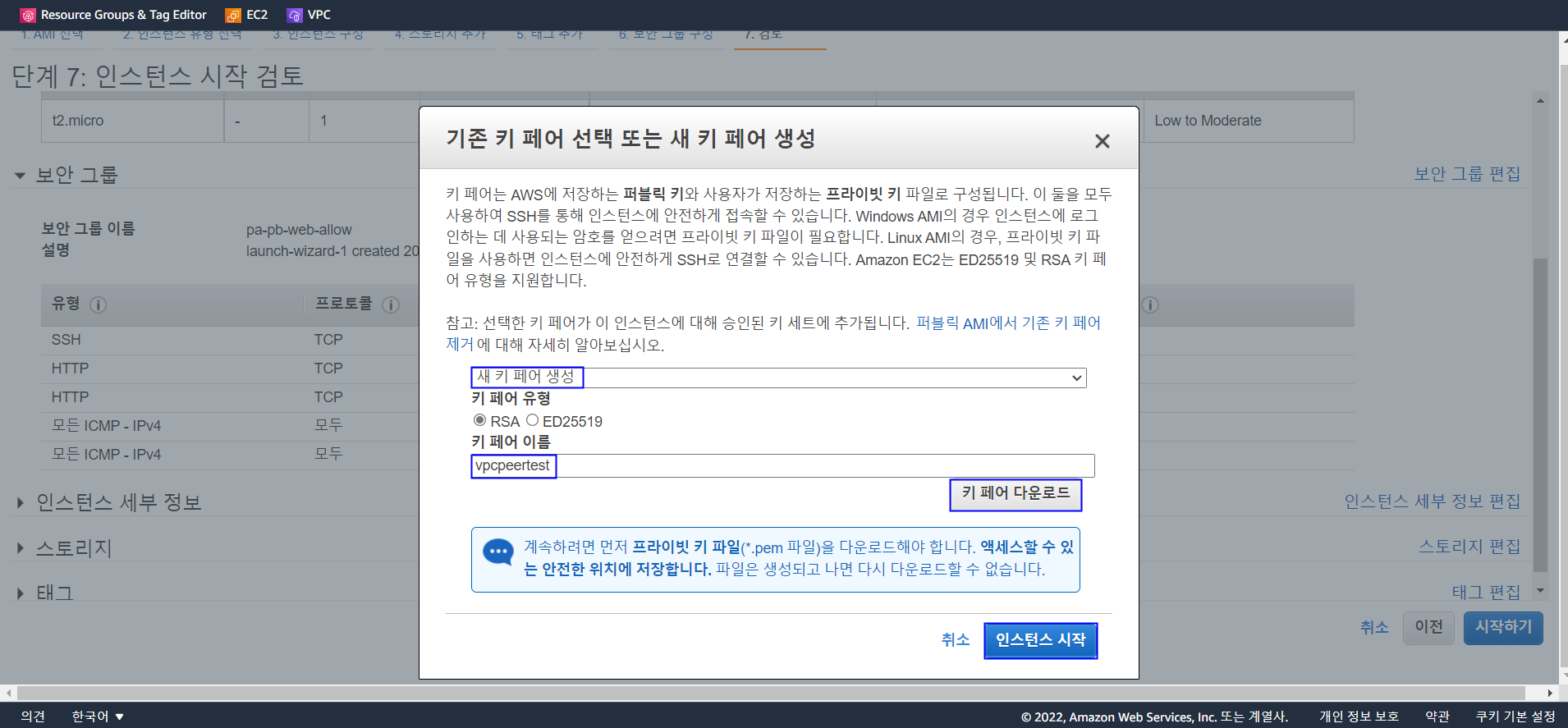 - [새 키페어 생성] - [키 페어 다운로드] - [인스턴스 시작]