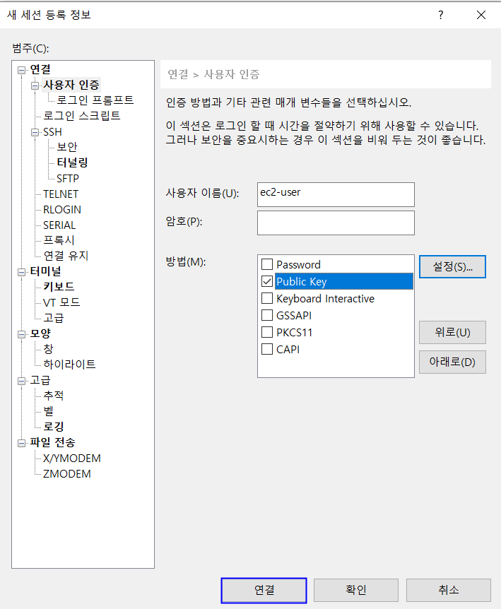 - [사용자 인증] - [사용자 이름: ec2-user] - [public key 체크] - [설정]