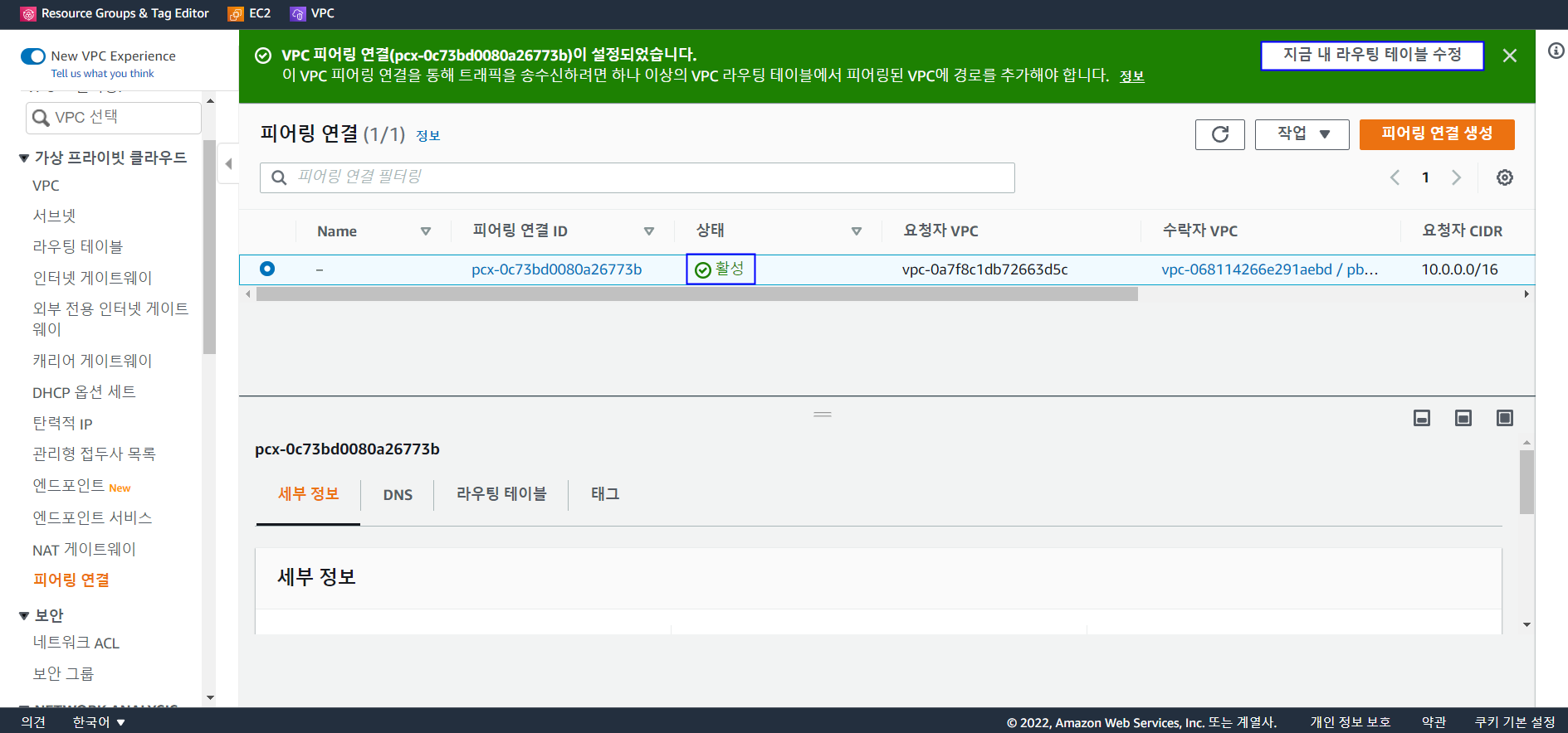 8) 피어링이 활성화 된것을 확인 후 , 상단의 [지금 내 라우팅 테이블 수정] 클릭 후 이동