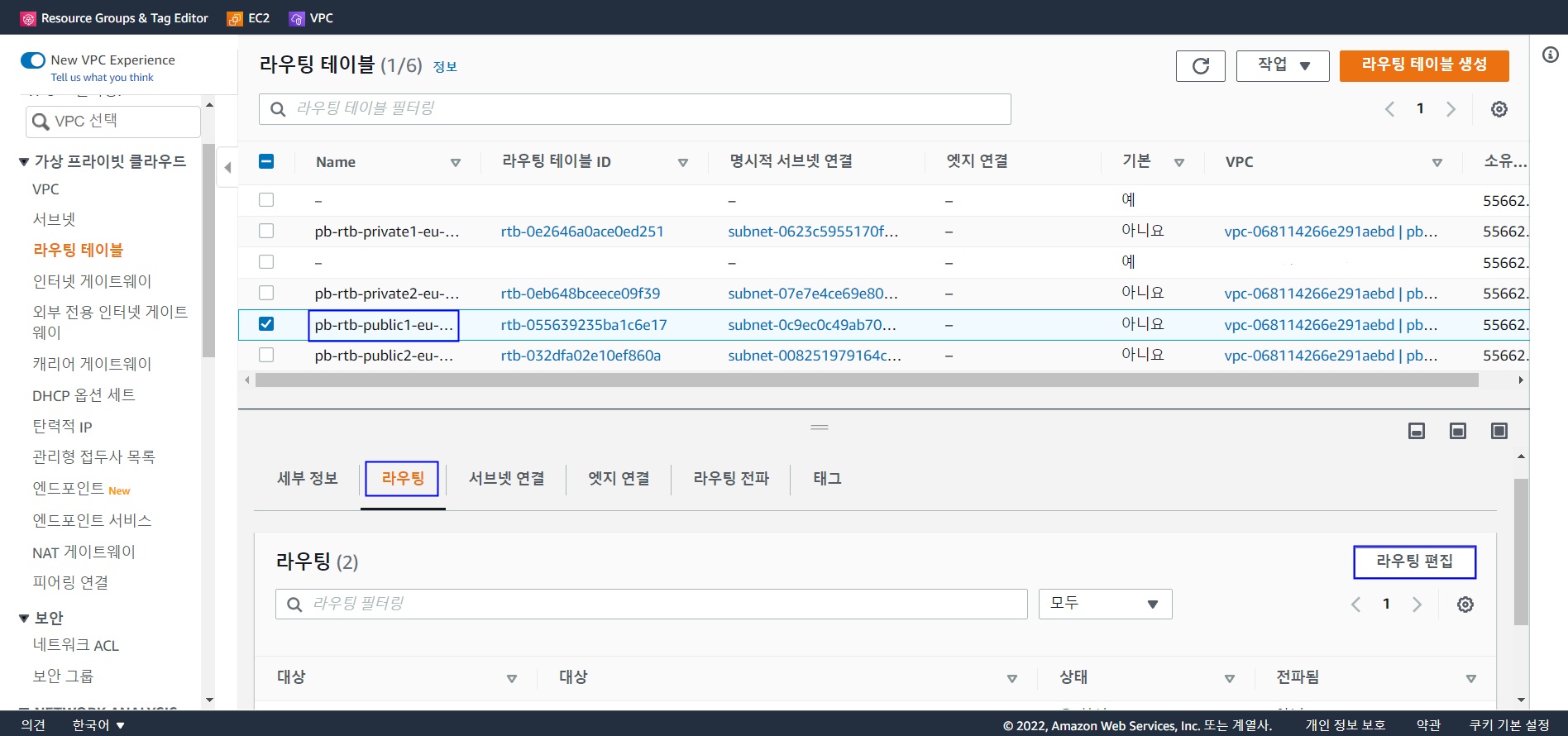 11) 런던 리전과 동일하게 public1과 public2의 라우팅 테이블 편집