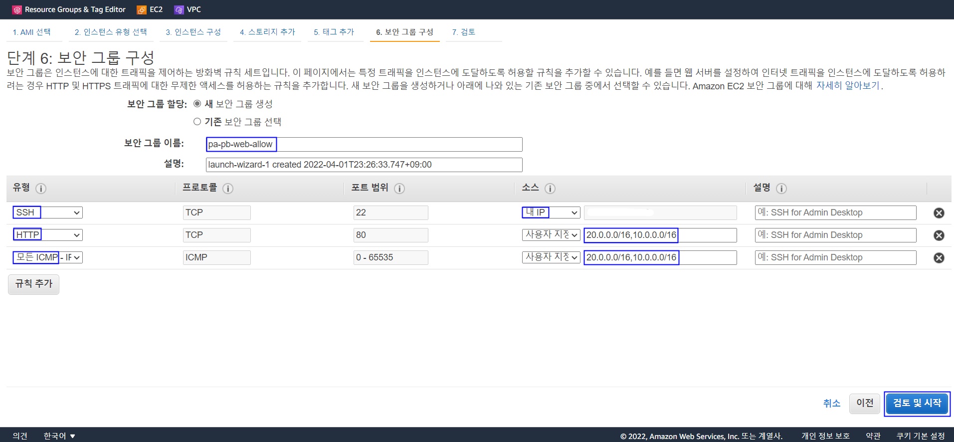 - ICMP : ping 확인용, 피어링된 VPC 주소, 내 VPC 주소