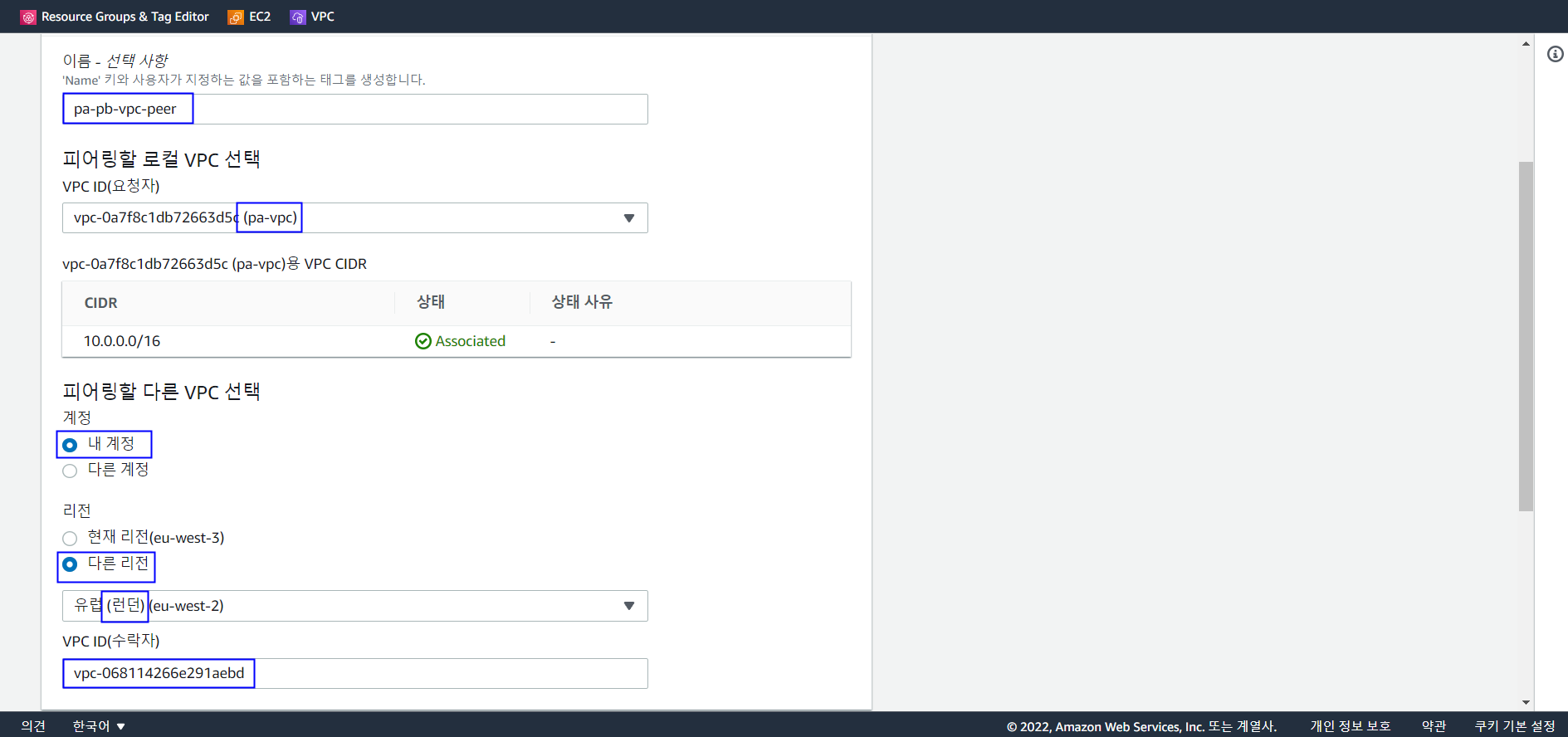 - VPC ID 수락자 : 이전에 기억해둔 런던 리전의 VPC ID 붙여넣기