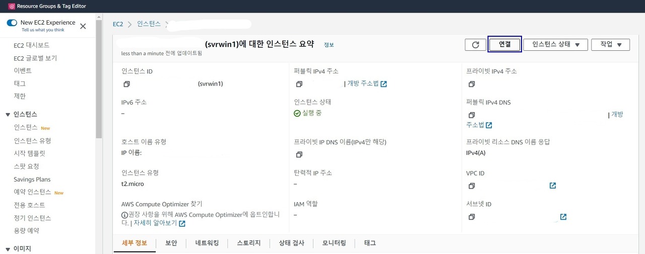 13) EC2 접속 > 생성된 인스턴스 ID 클릭 > 연결 클릭