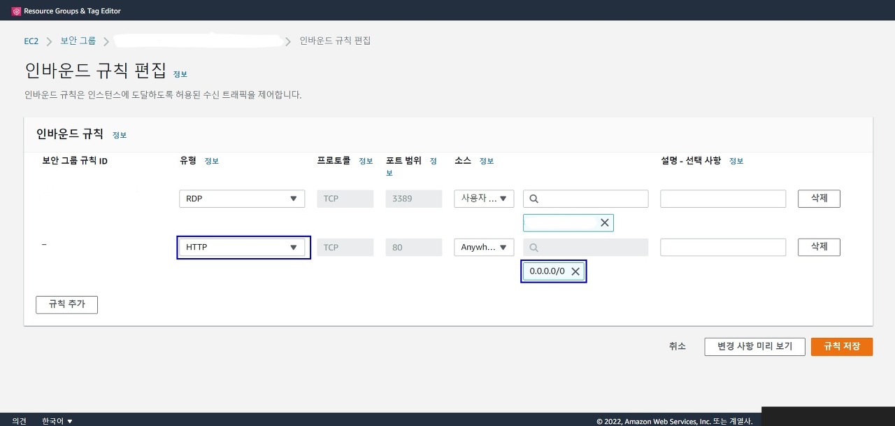 6) EC2 > 보안그룹 > HTTP 80번 포트 열어줌