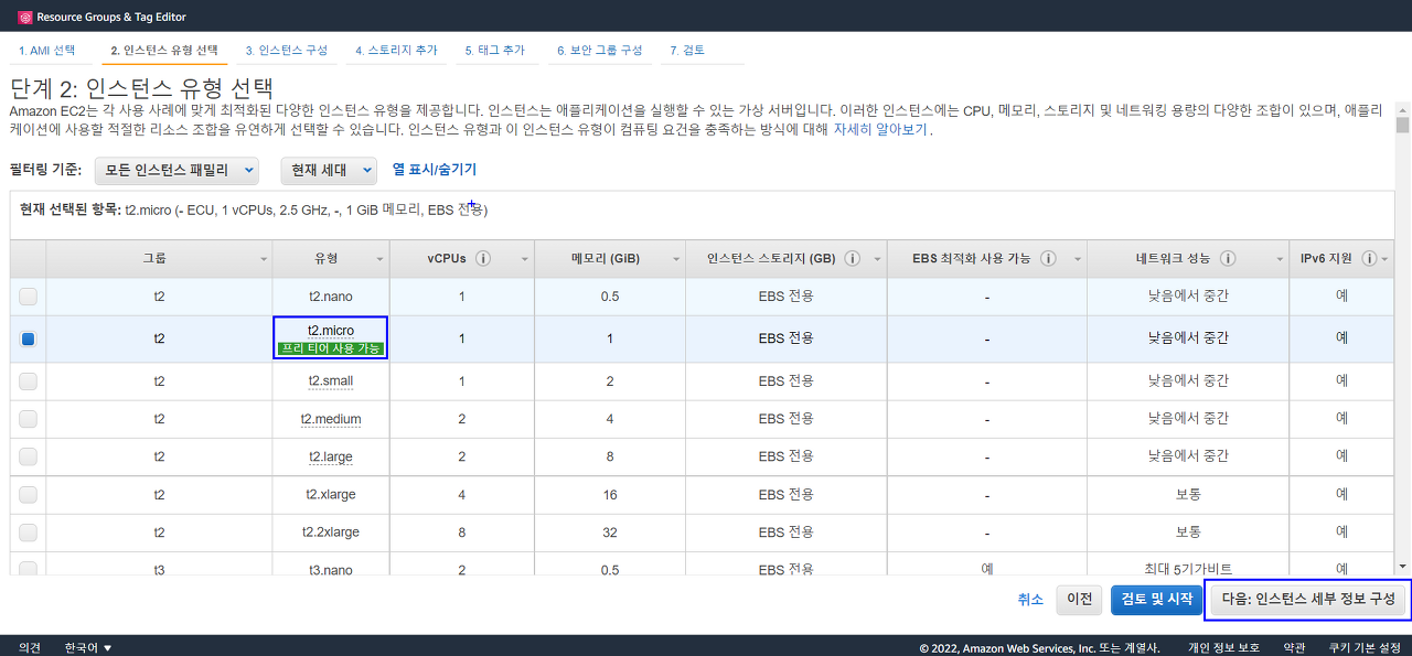 - Linux/Windows t2.micro 인스턴스 월 750시간 제동(1GB 메모리, 32bit or 64bit 플랫폼 지원)